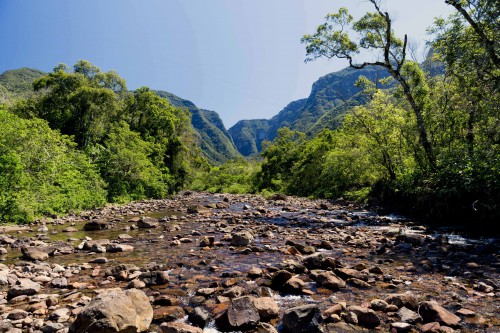 Hoje (16/09/14) foi mais um dia de céu azul, muito sol e temperatura agradável (em torno dos 24 graus). Perfeito para uma caminhada pela trilha do Canyon Malacara. A propósito, Praia Grande recebeu esse nome dos tropeiros que ao chegarem aqui viram o Rio Mampituba, com sua praia de pedras, e deram esse nome peculiar.