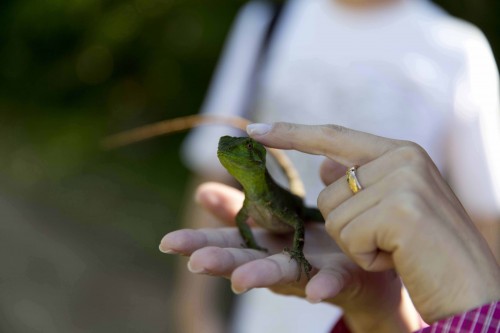 O passeio, que dura cerca de 3 a 4 horas e só pode ser feito com guia, impressiona pelas belezas naturais. Em muitos lugares a mata é secundária, resultado da antiga exploração de madeira no local, mas a natureza se recuperou e muito bem. Além dos canyons, vimos diversas figueiras, bromélias, amoras selvagens, pássaros e até lagartos como o que a Liene está segurando na foto – muito legal!