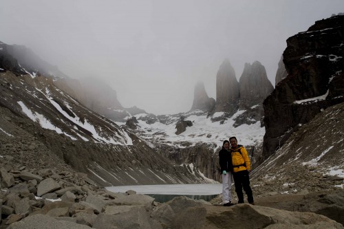 Também fizemos um passeio muito puxado de um dia inteiro até a base das torres, que é uma das pernas do W, com direito a neve, gelo, quedas, frio e muita lama. Nessa trilha, caminhamos pouco mais de 18 km, mas subimos cerca de 800 m. Apesar do cansaço valeu a pena conhecer as formações que dão nome ao parque. Para se ter uma ideia de como essa trilha é difícil, basta olhar o estado da bota do William (outro hóspede do Explora) ao final dela (ficamos com dó, mas foi engraçado).