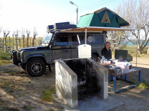 Camping El Griego (http://www.elgriego.com.ar). O camping fica afastado da cidade, quase na saída para Miramar. O camping faz parte de um complexo que inclui um parque aquático (tipo wet’n wild), mas fora da temporada tudo fecha. Não havia ninguém mais no camping e acabamos tomando um banho frio (a água não esquentava) e o wi-fi não funcionava.