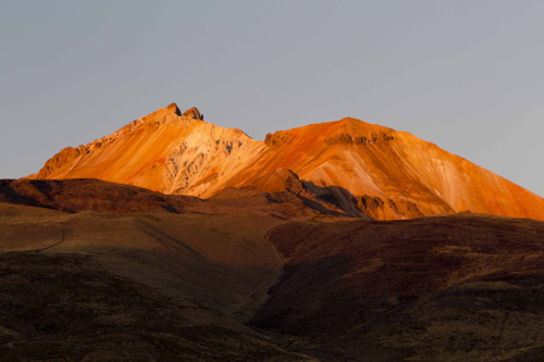 Vulcão Thunupa antes do pôr do sol visto de nosso refúgio em Tagua: