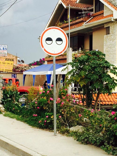 No final, da nossa chegada à fronteira até a contratação do SOAT perdemos quase 3 horas, mas deu tudo certo e conseguimos seguir para Cuenca, onde chegamos no fim do dia. No caminho vimos uma placa curiosa que não sabemos o que significa… Algum palpite?