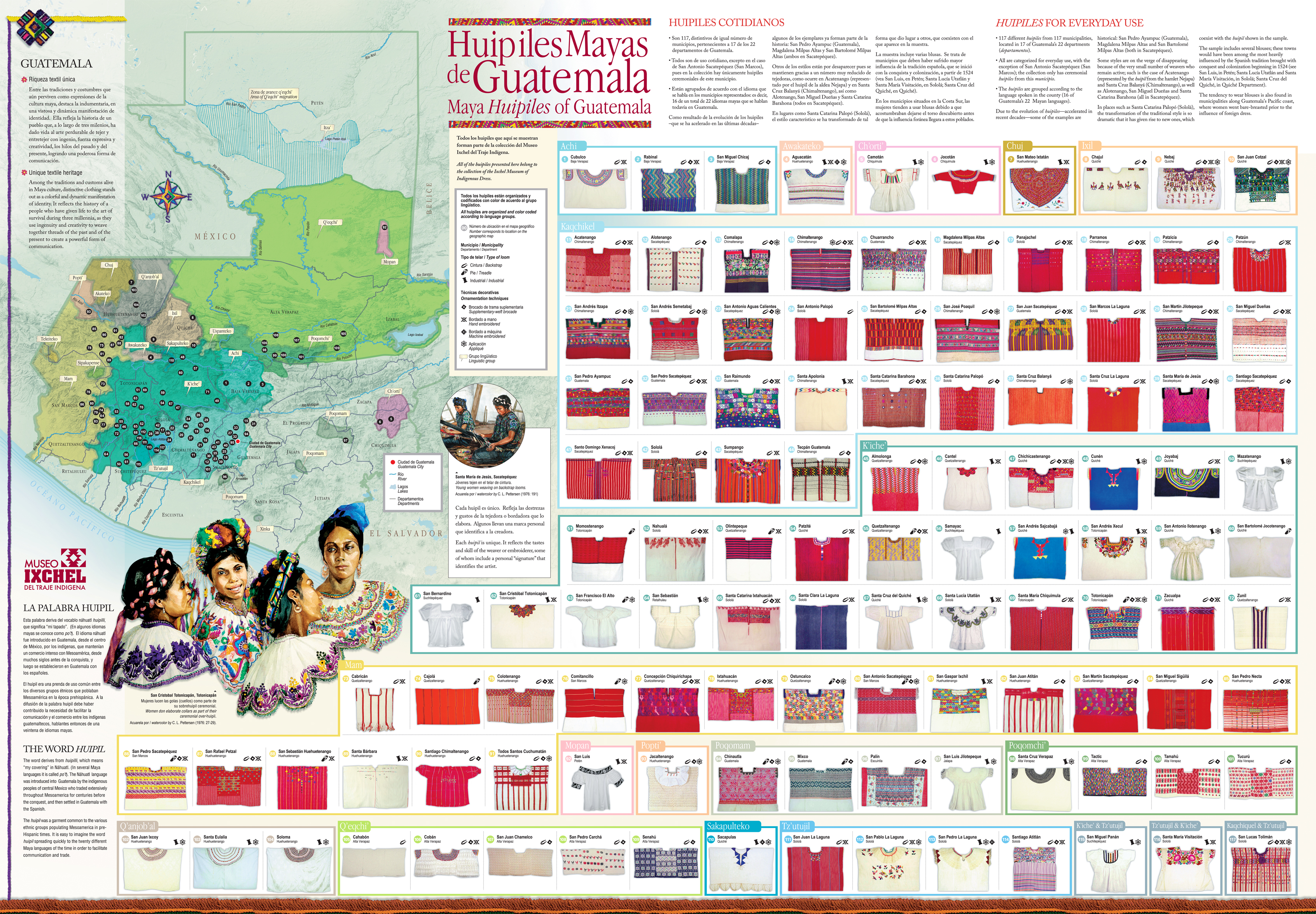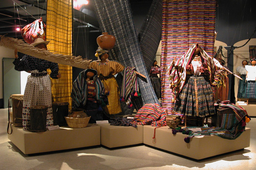 Em seguida visitamos o Museu de Trajes Indígenas Ixchel. Lá pudemos ver os diferentes trajes que são utilizados pelas tribos que vivem na Guatemala. É possível identificar a origem das pessoas apenas pelas cores, tramas, desenhos dos seus trajes; muito legal! Infelizmente não pudemos tirar fotos dentro do museu, então ficam apenas alguns registros que encontramos na internet.