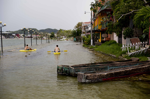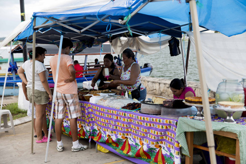 E por falar em chuva, desde que chegamos à região de Tikal não para de chover. Os locais dizem que é uma chuva totalmente fora de época, já que ainda estamos no período de seca, mas fora de época ou não, essas chuvas estão causando um estrago em lugares como a Isla de Flores, cujo calçadão (Malecon) e a rua que beira o lago estão alagados.