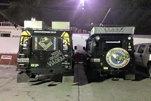 Tínhamos combinado de encontrar o Xixo, Bárbara e Francisco da Nossa Grande Viagem (http://www.nossagrandeviagem.com | https://www.facebook.com/pages/Nossa-Grande-Viagem/476918712450520?fref=ts) em Los Mochis antes que eles embarcassem no ferry para a Baja California, mas com o problema do trem ficamos apenas com o registro feito por eles da Lola (Defender da Nossa Grande Viagem) e o Godzilla no estacionamento do hotel em Los Mochis.