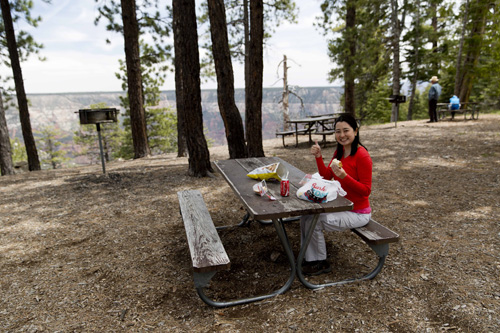 O lado norte do Grand Canyon é bem menos movimentado do que o lado sul, mas como ele fecha no inverno, os meses em que está aberto são bastante concorridos, especialmente para quem quiser ficar no camping ou no hotel que existe dentro do parque. Obviamente chegamos sem reserva e não tinha lugar para ficar, assim só caminhamos um pouco, fizemos um picnic e seguimos em direção a Cidade de Kanab, no Estado do Utah.