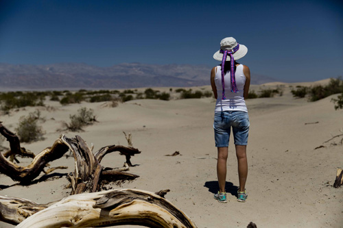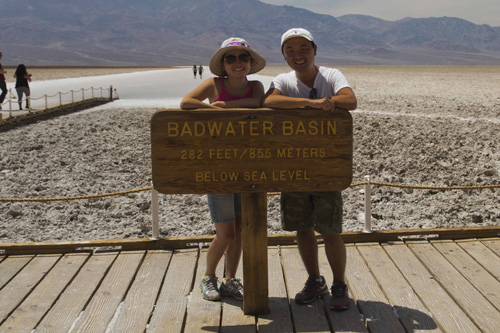 No dia 28/05/15 saímos de Las Vegas e seguimos rumo ao Death Valley na fronteira entre Nevada e Califórnia. Esse lugar faz jus ao nome e sozinho é dono de 3 recordes impressionantes: o da maior temperatura já registrada (137 Fahrenheit / 57 Celsius), o do lugar mais seco da América do Norte (chove em média 60 mm por ano), e o do ponto mais baixo dos EUA (282 ft / 86 metros abaixo do nível do mar).