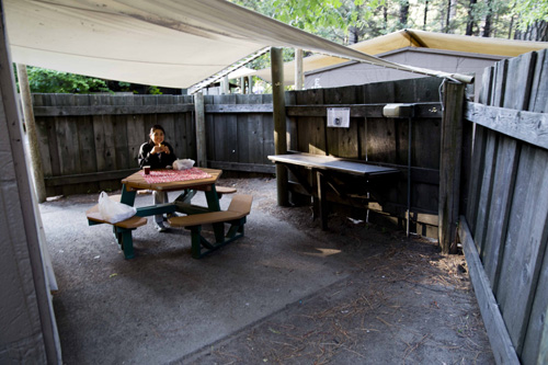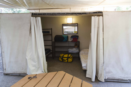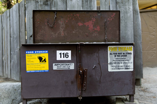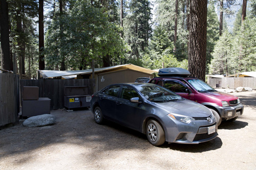 Demos muita sorte pois conseguimos reservar um camping no Yosemite Village por 3 noites. O esquema desse camping é muito legal, pois são cabanas pré-montadas com 3 paredes de alvenaria e uma parede e teto de lona, uma área cercada com mesa para 6 pessoas, uma pequena bancada que serve de cozinha e uma churrasqueira do lado de fora. A cabana acomoda 4 pessoas (1 cama e 1 beliche), mas é possível colocar 2 camas extras.