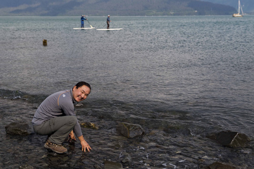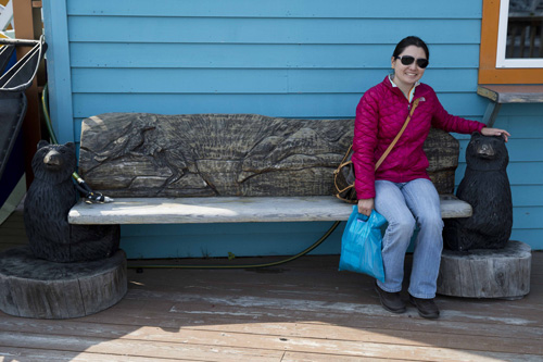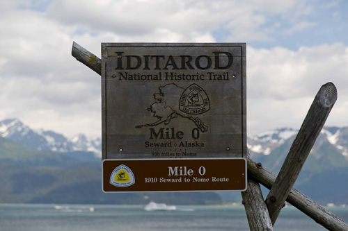 Depois de resolver a questão da acomodação, fomos caminhar pela cidade. Vimos alguns barcos de pesca charter retornarem cheios de salmão vermelho do Alasca fresquinho (hum!), passeamos pelas ruas de Seward, colocamos a mão na água do mar gelada (não dá para entrar de jeito nenhum) e visitamos alguns pontos históricos. Um deles é particularmente interessante, o marco zero da Iditarod Trail.