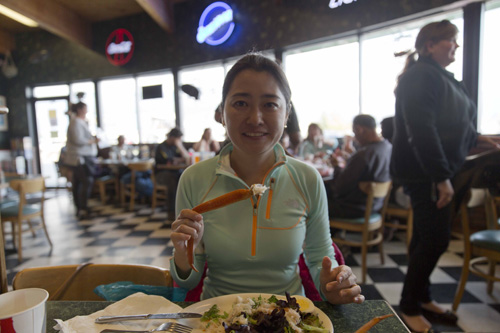 À noite (modo de dizer pois só escureceu às 23h35 e amanheceu pouco depois das 4 da manhã) comemos um Carangueijo das Neves do Alasca (sim, aquele que aparece no programa do Discovery – Deadliest Catch!). O pernudo (como diz a Rosely do Vamos pro Alasca) pode chegar a medir um metro e meio e é servido apenas cozido, com uma manteiga derretida e um pouco de limão. Muito bom!