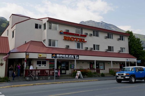 Breeze Inn Seward (http://www.breezeinn.com). Por conta do feriado de 4 de julho a cidade estava abarrotada de turistas de todas as partes. Foi impossível achar um lugar nos campings da cidade e acabamos optando por um hotel. Estacionamento aberto e wifi. O valor ficou um pouco caro, mas não havia outro hotel disponível.