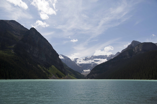 De lá seguimos até um dos lugares mais bonitos que vimos em nossa viagem de 2009, Lake Louise. Às margens do lago está localizado um luxuoso hotel da rede Fairmont e quando passamos por aqui em 2009 (com dívidas da obra do apartamento, sofá, casamento etc.) nos perguntamos se um dia teríamos condições de ficar hospedados nesse hotel. Nessa viagem até pensamos em ficar hospedados lá, mas quando chegamos e demos de cara com uma verdadeira enxurrada de turistas, além da módica diária de 650 USD, acabamos desistindo.