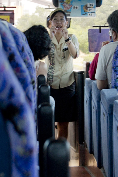 Depois de degustar algumas vezes o produto da Orion (unicamente para conferir a qualidade, temperatura, espessura do colarinho etc.) regressamos ao ônibus e como estávamos “alegres” o jeito foi cantar (rs). A nossa guia Ai-san puxou o coro e cantou duas músicas típicas de Okinawa enquanto nos dirigíamos ao Aquário Charumi – muito legal!
