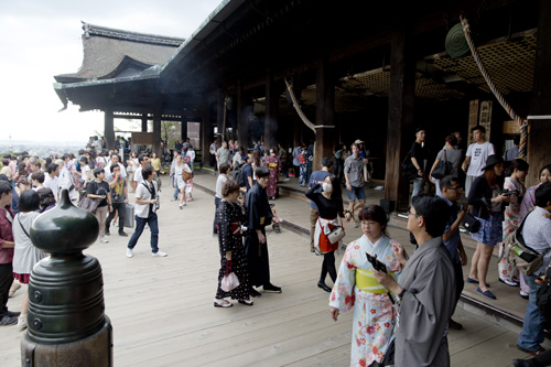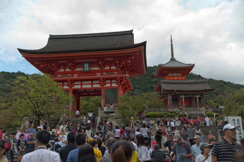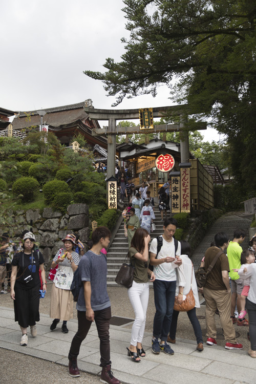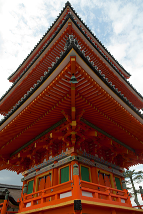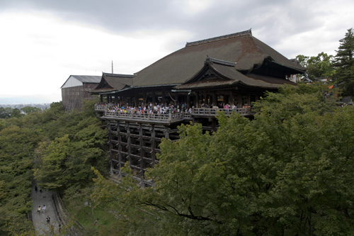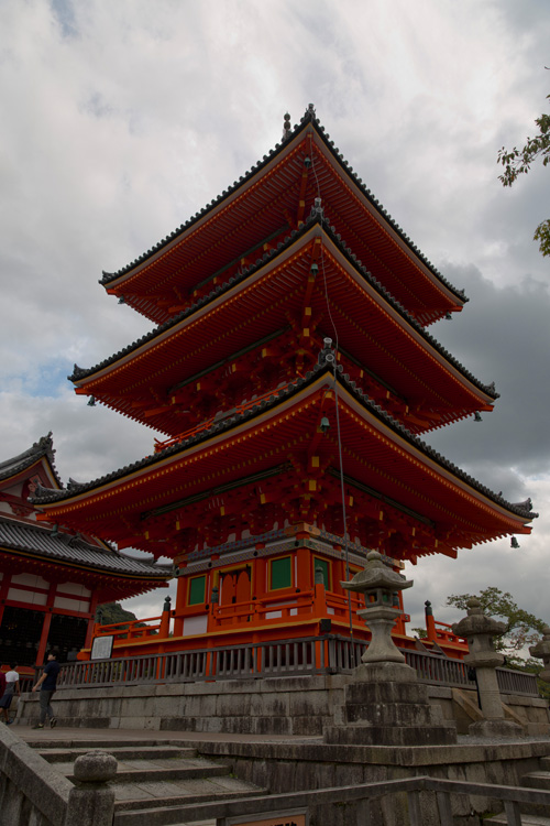 Voltando ao budismo, fechamos nosso dia em Kyoto visitando o Templo de Kyomizu-dera fundado em 778. O prédio principal foi construído em 1633 por ordem de Iemitsu Tokugawa, terceiro shogun da Dinastia Tokugawa e se sua enorme estrutura já não for suficientemente impressionante, leve em consideração que não foi utilizado um único prego sequer na sua construção.