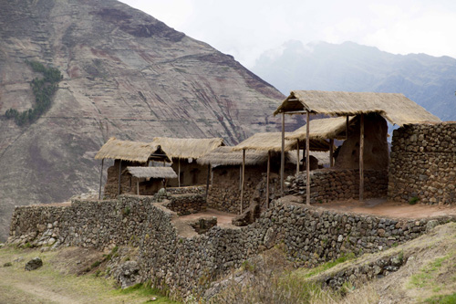 Huaca Larga ao fundo (coberta com o telhado) e demais construções.