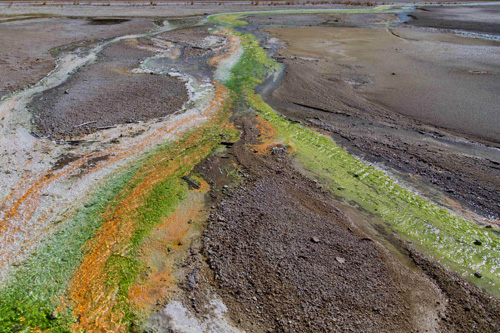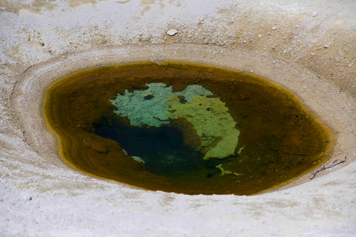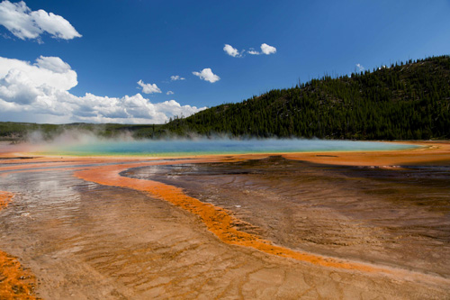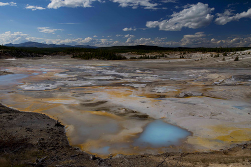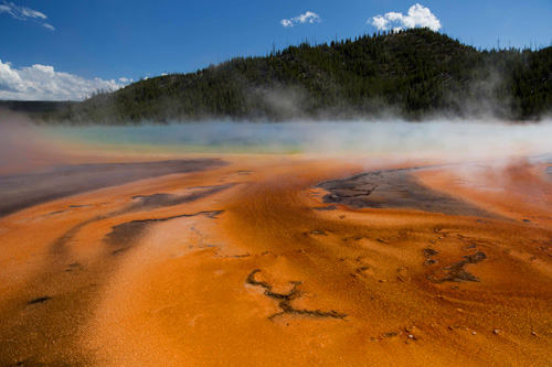 Saindo do Old Faithful passamos pelo Grand Prismatic Srping, que é uma lagoa termal super colorida devido à presença de uma bactéria que gosta de calor. As cores são indescritíveis, mas da passarela construída pelo parque não é possível ver toda a lagoa, apenas a borda e mesmo assim é incrível!